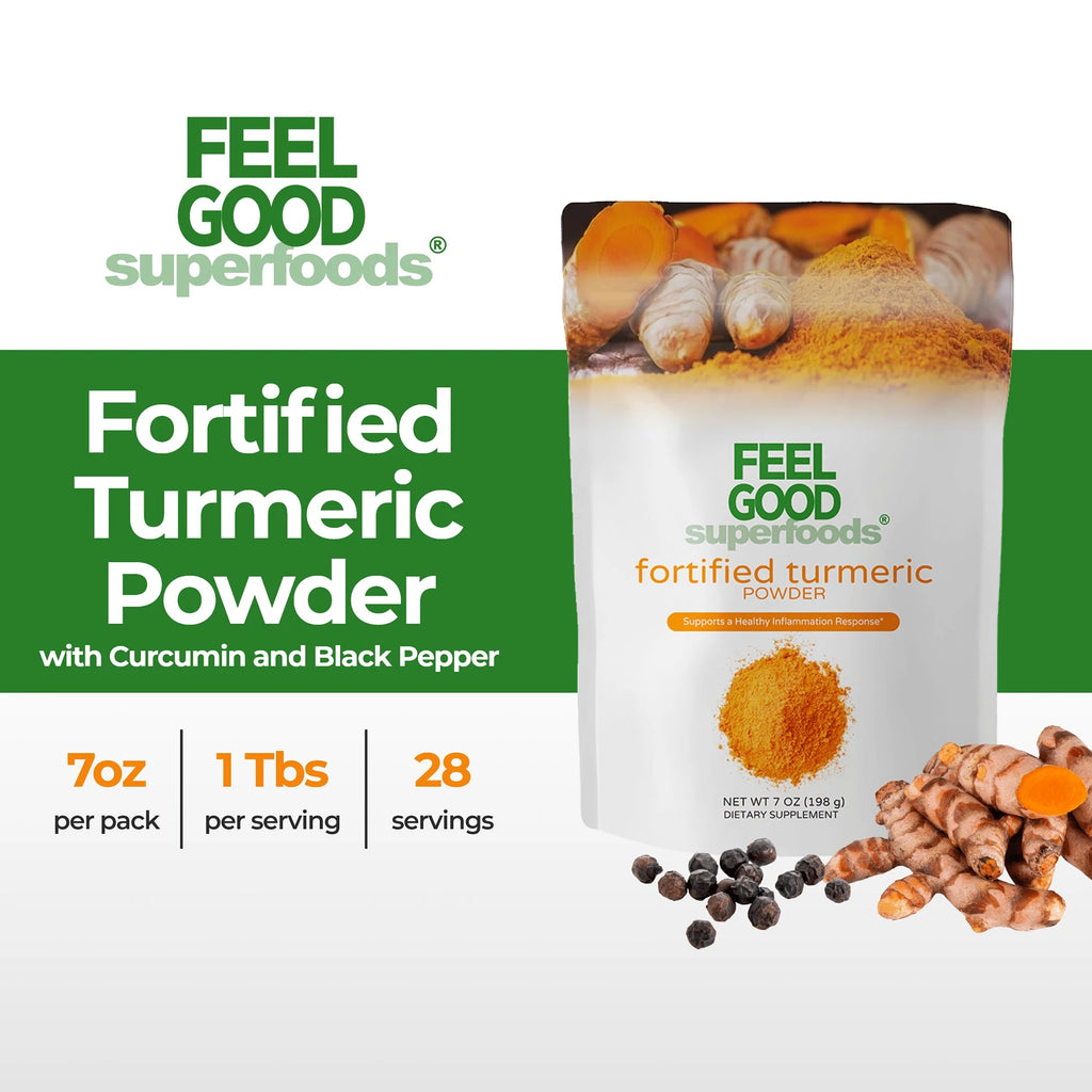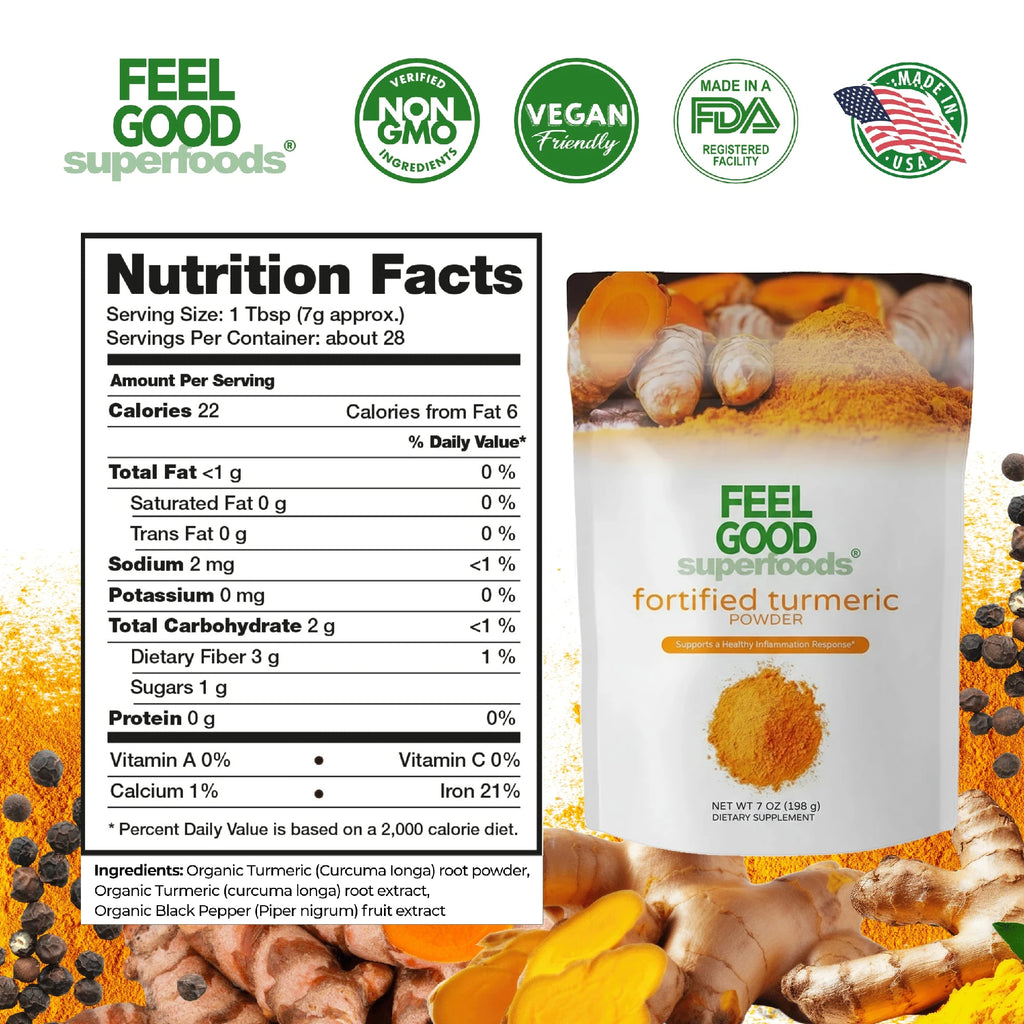 FeelGood Organic Superfoods® Fortified Turmeric Powder will enhance your drinks, smoothies and culinary dishes. This nutrient-rich superfood powder is non-GMO, gluten free and vegan-friendly.