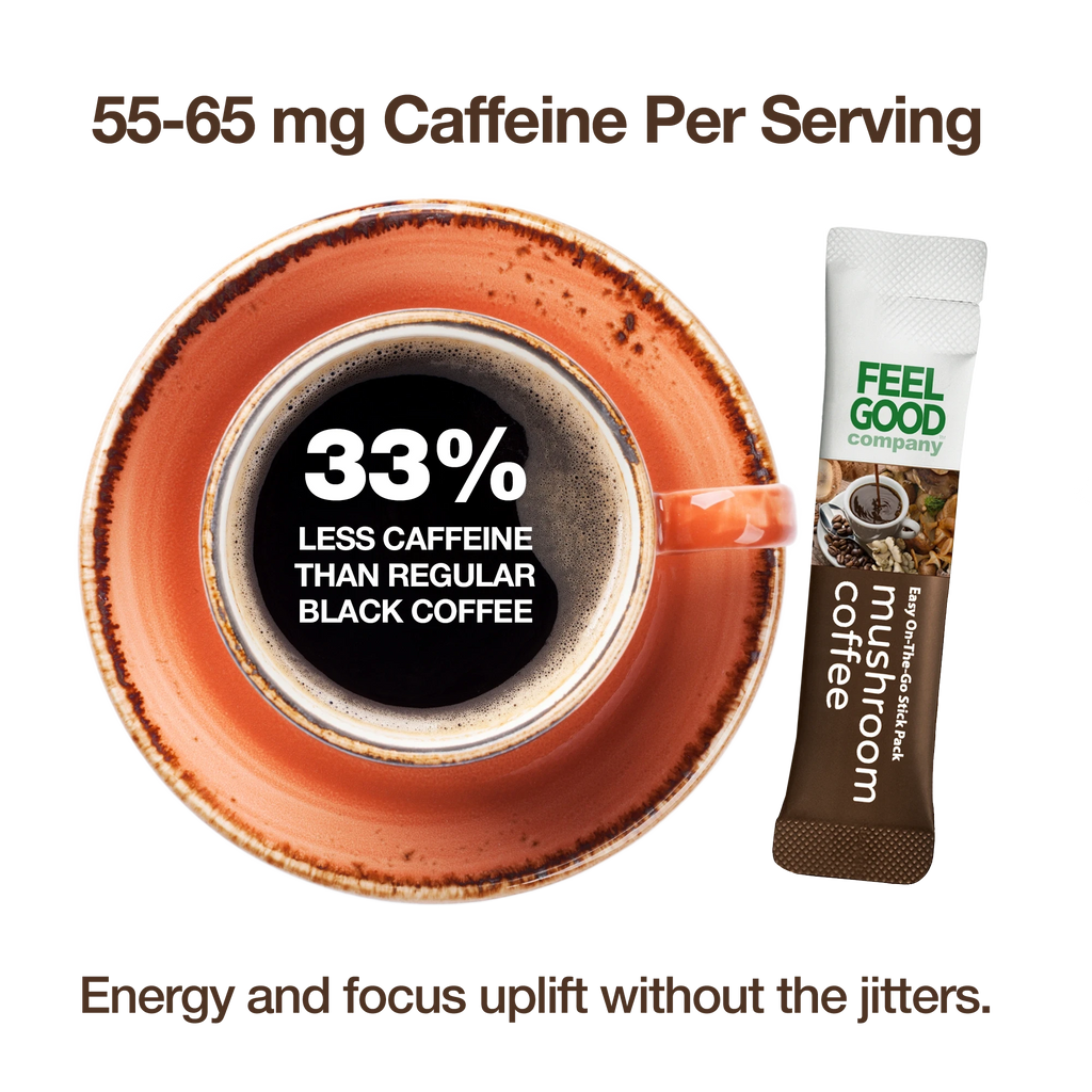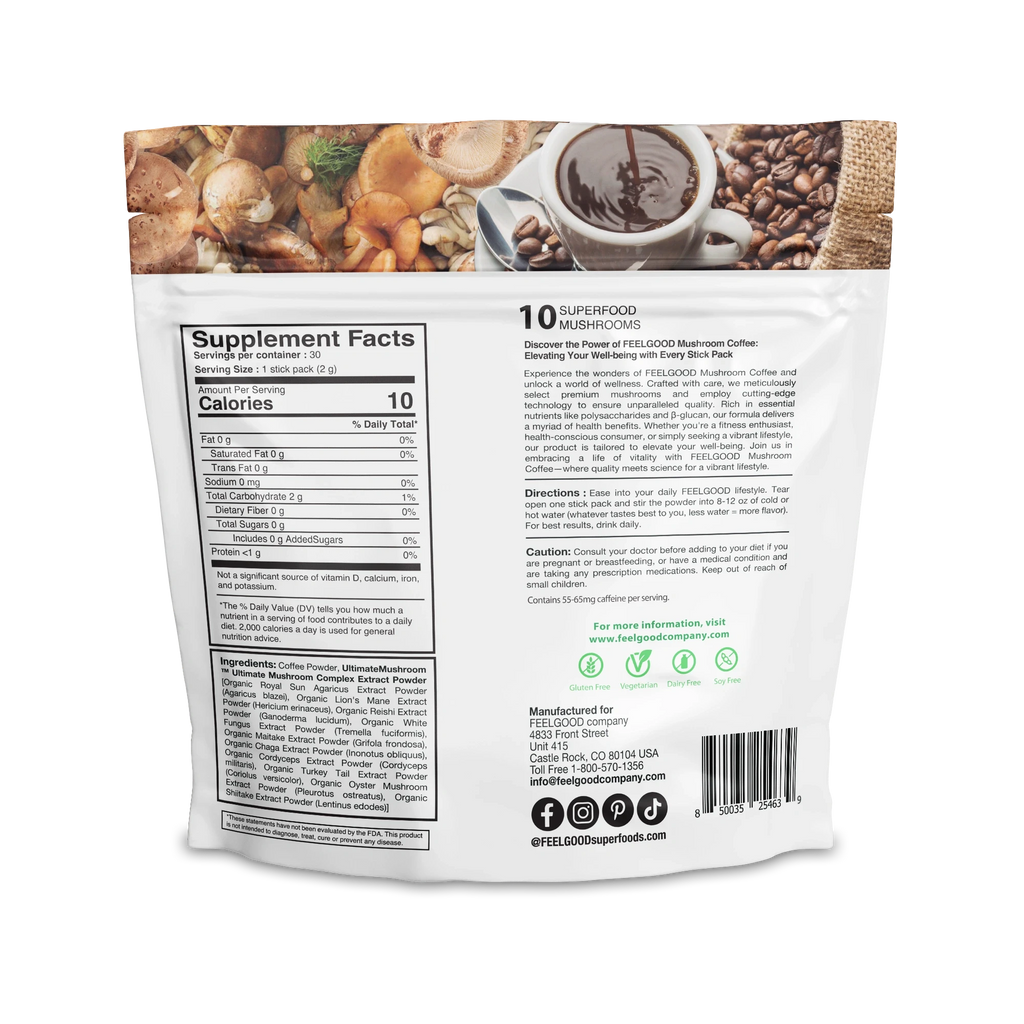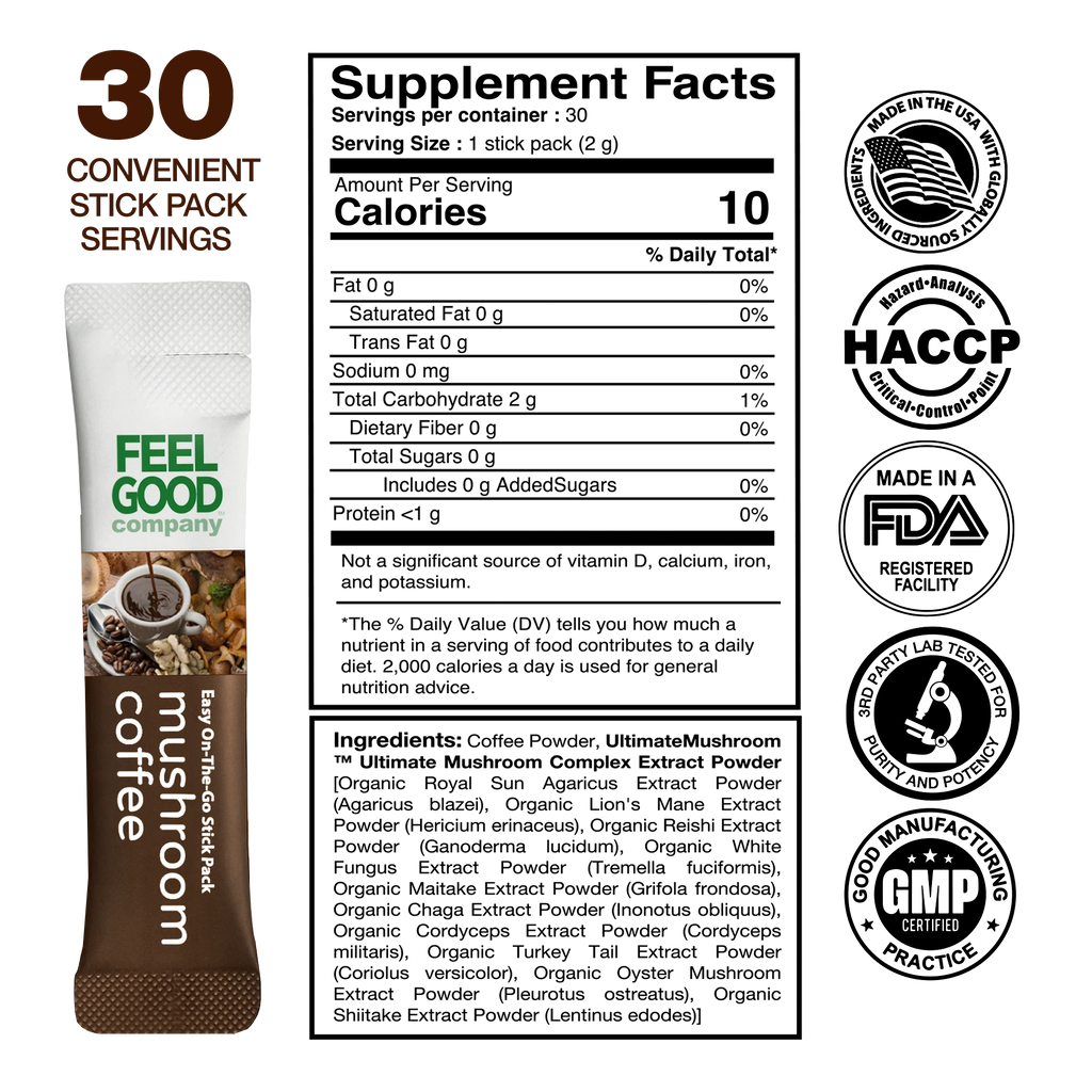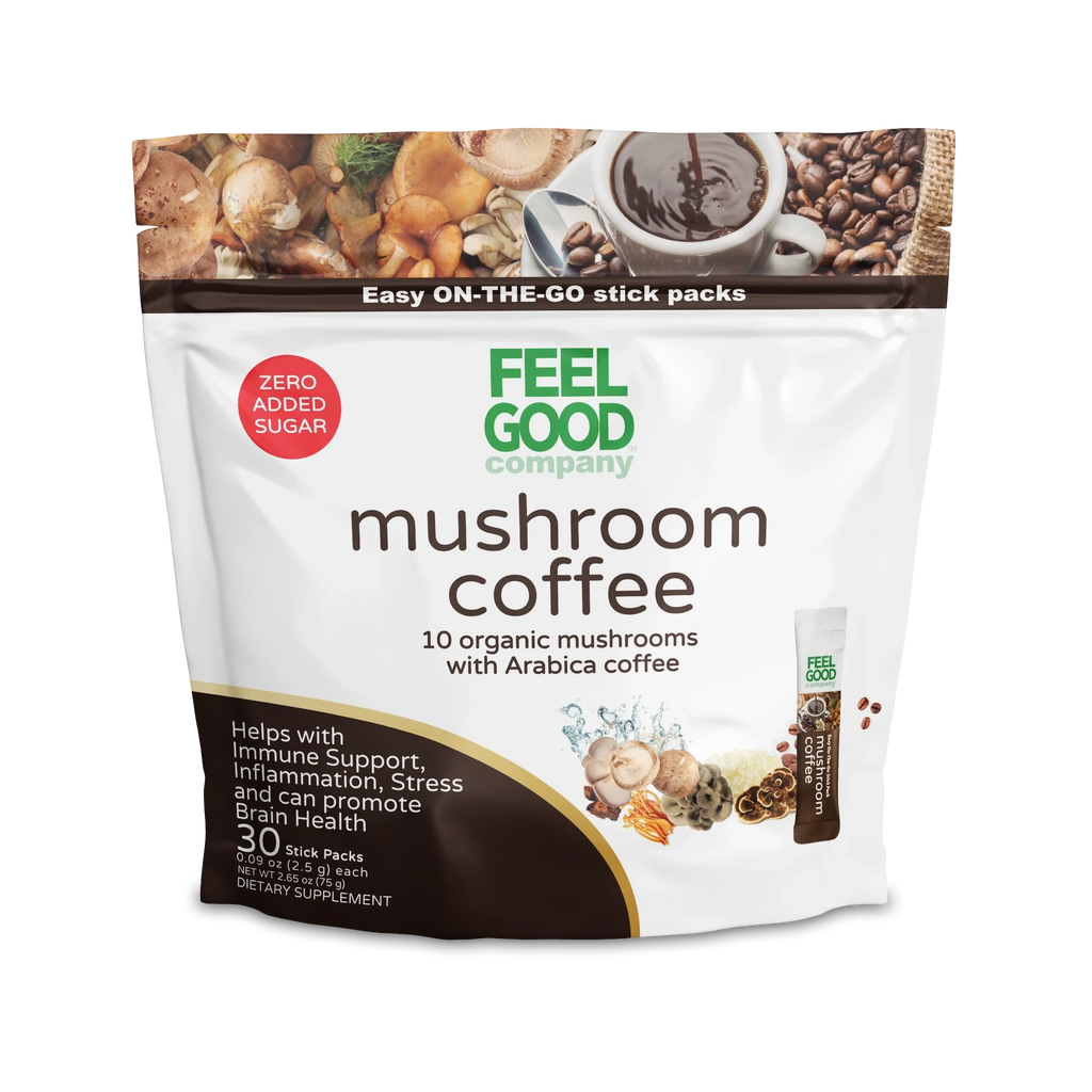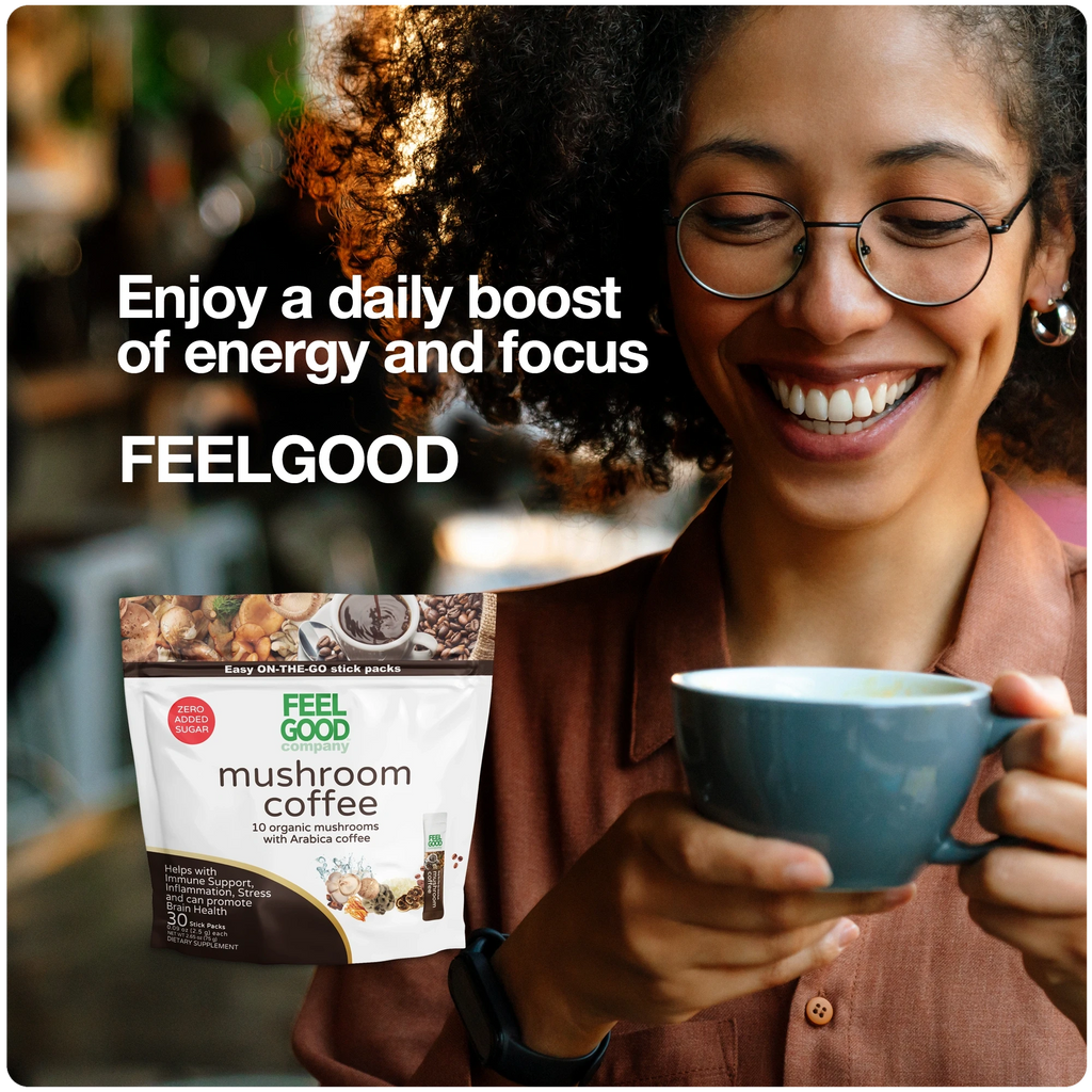 FEELGOOD Company™ Mushroom Coffee combines smooth Arabica instant coffee with ten functional mushroom extracts to deliver steady energy, mental clarity, and whole-body wellness support. The natural caffeine from coffee provides a quick boost in alertness, while Lion’s Mane helps support focus and cognitive function. Adaptogenic mushrooms like Reishi and Cordyceps help your body respond to stress more efficiently, promoting calm and balanced energy without the jitters. Antioxidant-rich mushrooms such as Chaga, Turkey Tail, Maitake, and Shiitake support immune health and cellular protection. Together, these ingredients create a clean, uplifting coffee experience that helps you stay sharp, centered, and energized throughout the day—simply mix, sip, and feel good.Directions: Ease into your daily FEELGOOD lifestyle. Tear open one stick pack and stir the powder into 8-12 ounces of cold or hot water (whatever tastes best to you, less water = more flavor). For best results, drink daily.