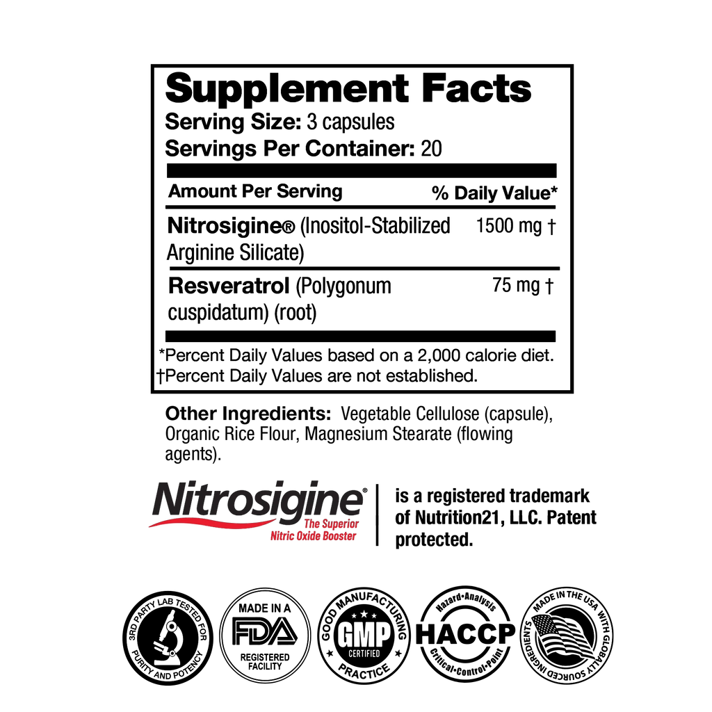 Nitrosigine® is a patented complex of inositol-stabilized arginine silicate. It’s clinically studied to significantly boost nitric oxide production, support stronger muscle pumps, improve nutrient delivery, and enhance cognitive performance. It works quickly and its benefits can last up to six hours.What benefits does resveratrol add?